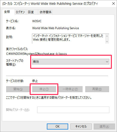 プロパティ画面の「スタートアップの種類」で「無効」を選択し、「サービスの状態」で「停止」ボタンをクリックします。