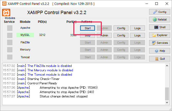 XAMPPのコントロールパネルで再度、Apacheの起動を試みます。画面でもわかりますように、ちなみにバージョンは3.2.2です。