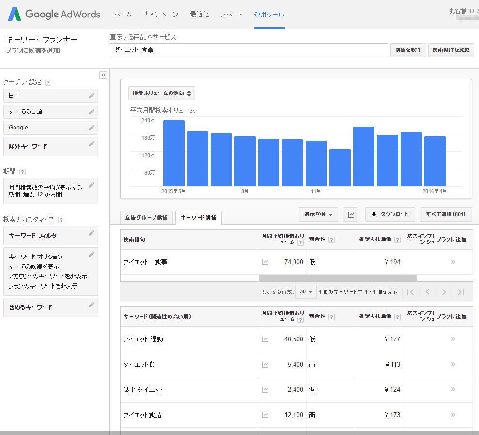 Googleのアカウントを持っていれば誰でも使うことができ、実際に対象のキーワードがどのくらい検索されているか月平均の回数がわかります。デバイスごと、地域ごとなど、切り替えて見ることができる便利なツールです。