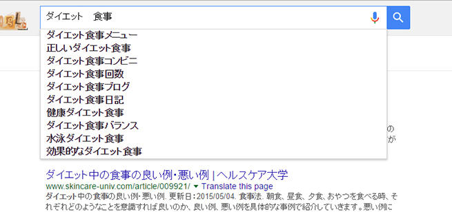 検索窓のキーワードを入力すると自動的に表示されるのでほとんどの方が知っていると思いますが、今、調べようとしているワードについて、他にどのようなワードで調べられているかが表示されます。